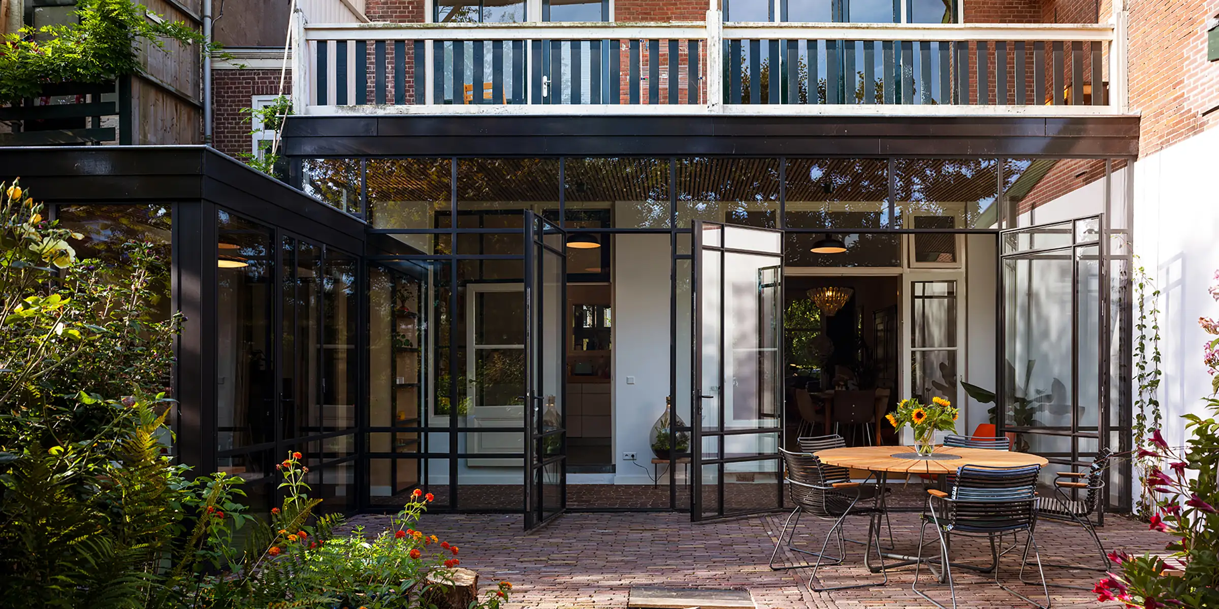 De woning is uitgebreid met een luchtige serre die naadloos de overgang maakt tussen binnen en buiten.