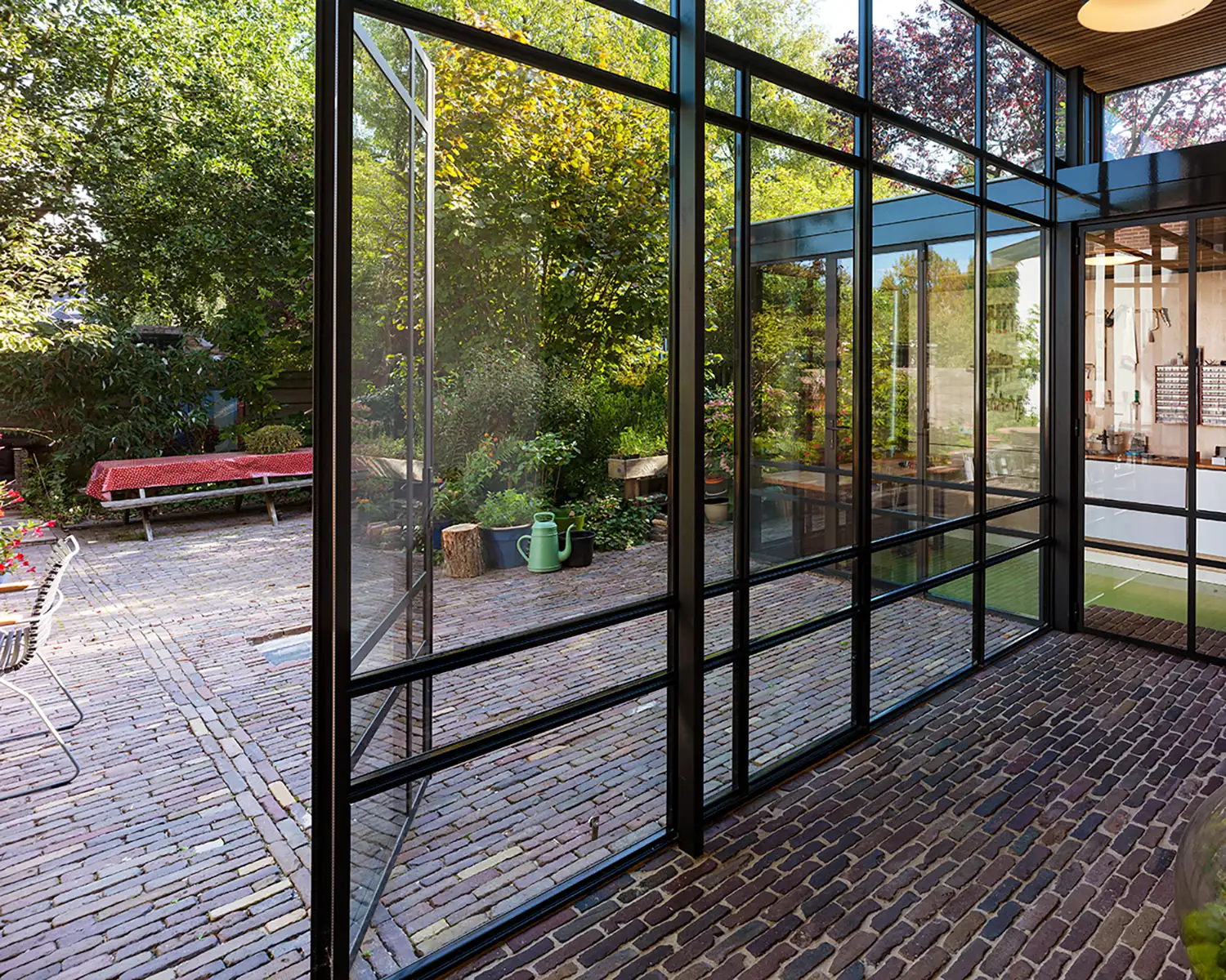 Met het project Botanical Living hebben Hannes en Anke hun ideale retraite aan de tuin gerealiseerd. De aanbouw is een oefening in licht en tactiliteit: de robuuste bakstenen vloer vormt een prachtig contrast met het warme cederhouten plafond en de ragfijne stalen profielen.